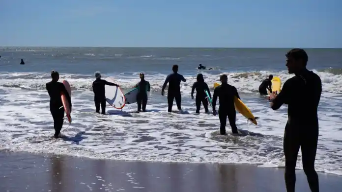Ambos llevan adelante la Escuela de Surf en La Baliza, ubicada en el balneario del mismo nombre —a unos 400 metros de la calle principal hacia el norte—, donde desde hace ocho años dictan clases particulares y grupales para todas las edades, tanto a residentes como a turistas. A ellos, se sumaron como profes Juanse y Facundo, todos con el curso aprobado de Instructor Nacional de Surf.